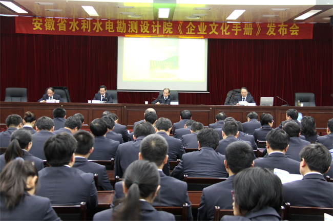 發布會上,院領導用翔實的文字資料和圖片,宣講了院企業宗旨、企業精神、價值理念、管理理念、經營方針和質量方針等企業理念,激勵員工愛崗敬業,增強企業凝聚力,提升核心競爭力。要求設計院員工進一步服務安徽水利發展大局,精心培育企業文化,治水興業,同創共享,為安徽水利事業再創佳績,再立新功。